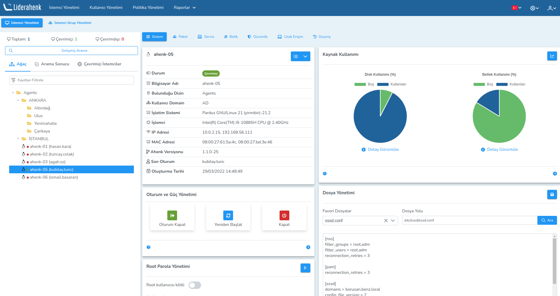 Various tasks can be sent for a single client selected in the Client Management section. The tree structure visible on the left Thanks to this, online users can be filtered between clients instantly. In addition, all client and The number of online clients is at the bottom of the tree. Regarding name, ID and folder between clients calls can be made.