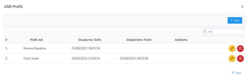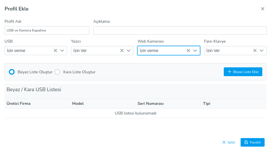 It regulates the permissions on USB modules and devices. Webcam, printer, USB memory on the related Ahenk machine and edit mouse-keyboard permissions. As a result of selecting the do not allow option, the user can delete the disallowed usb module. cannot use. If none of the allow or deny options are selected, the relevant usb element will not be allowed. For this reason, the "Allow" option must be selected for permission.