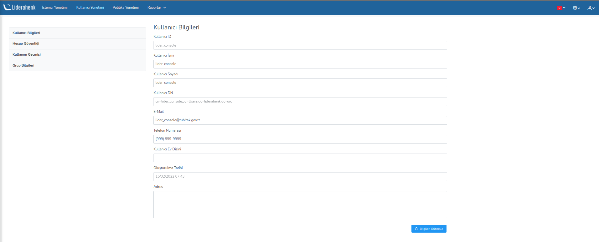 User Information User information This is the page where the user who logs in to Liderahenk application can edit their personal information.