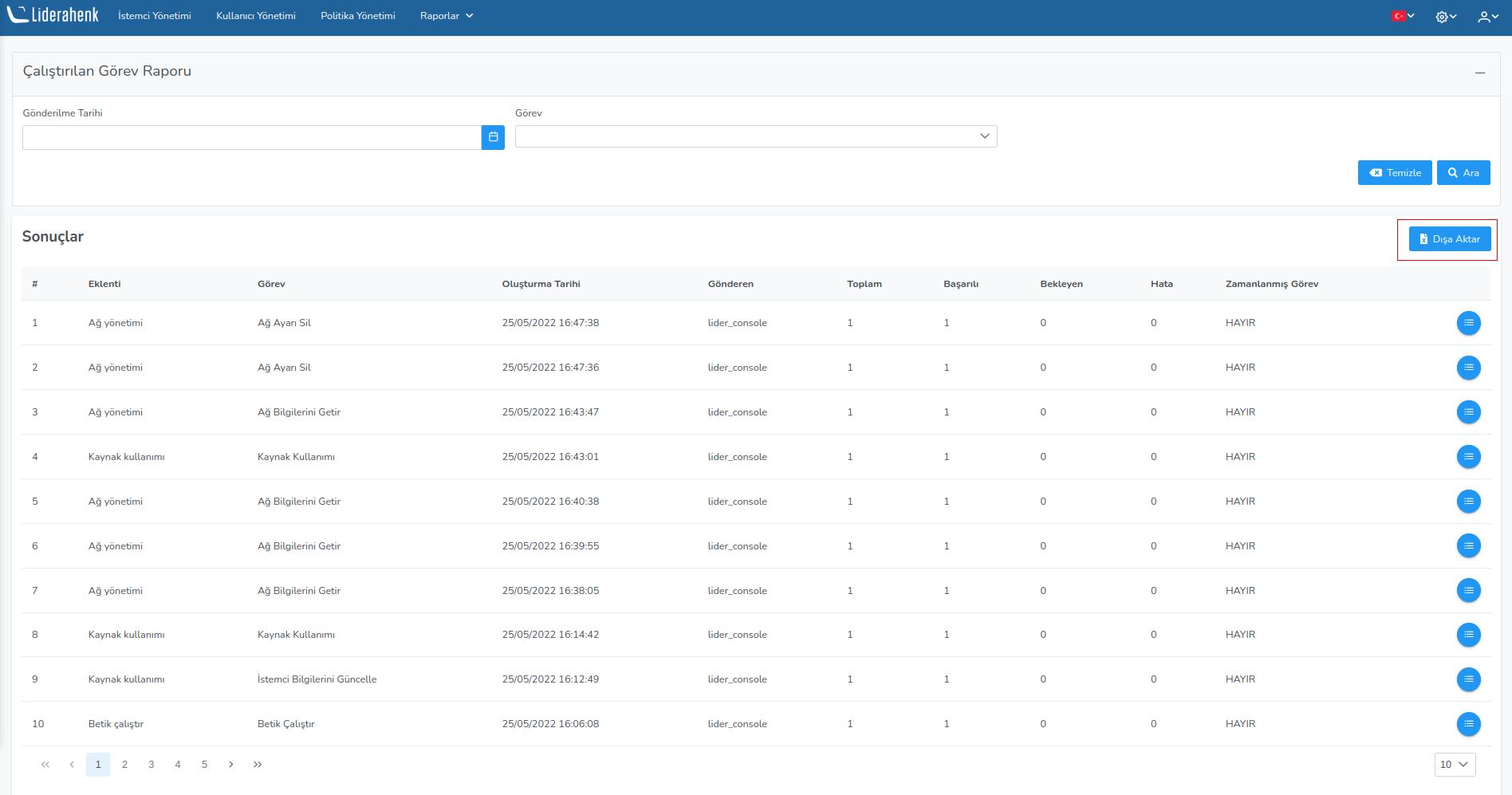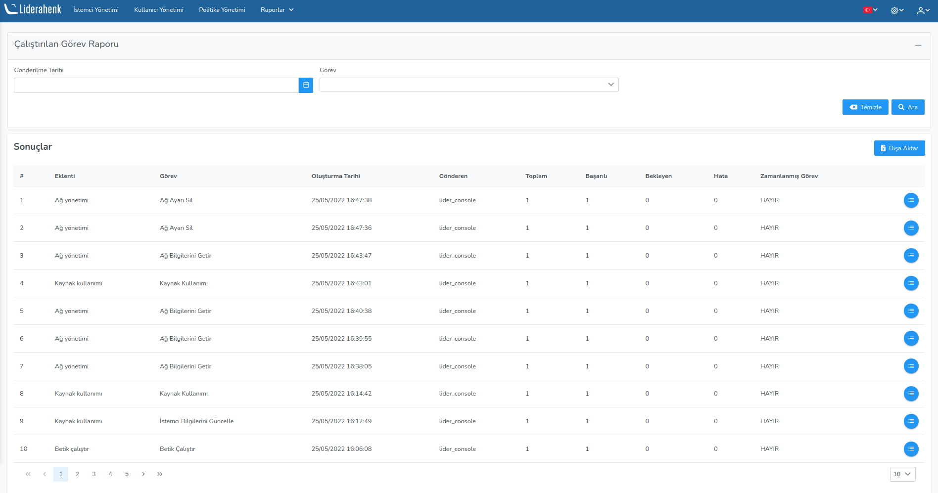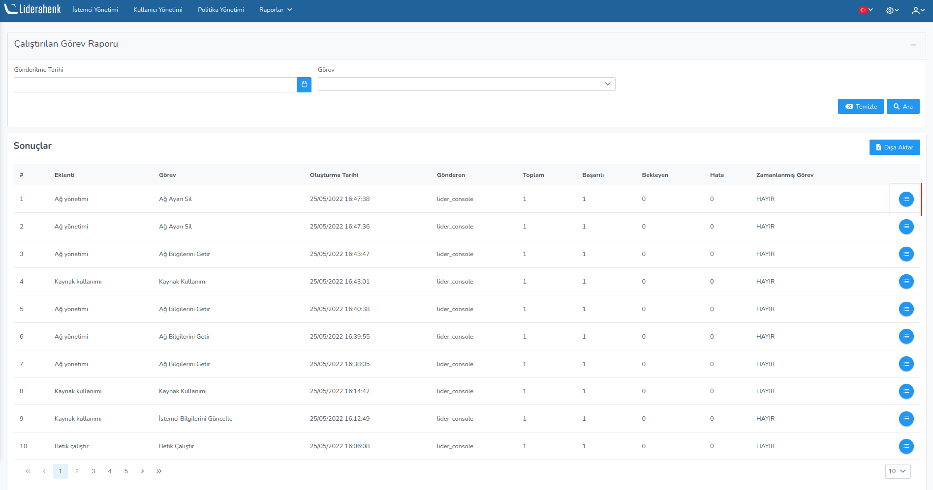 In the executed task reports section, information is given about the client or the tasks sent to the clients. How many clients the run task was sent to, how many clients got errors, how many clients successfully observed on this page.