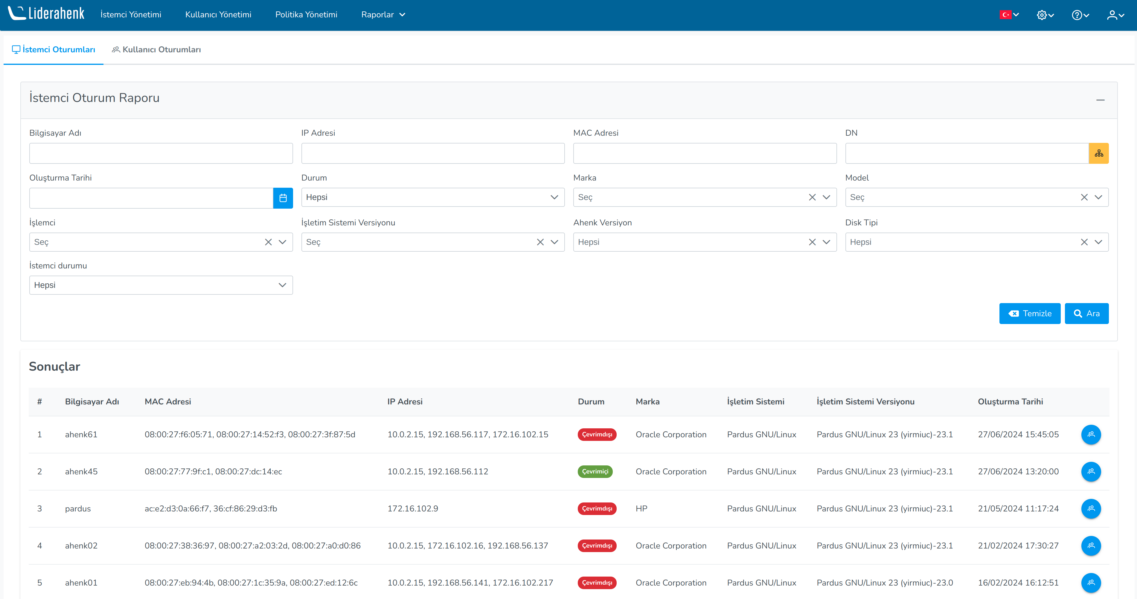 On the Client Sessions page, the users logged in on the clients are displayed, and the clients are filtered by: Computer Name, MAC Address, IP Address, DN, Status, Phase, Brand, Operating System, Version, Ahenk version, and Creation Date. By clicking the details button, users who have logged in and logged out on the client can be observed.