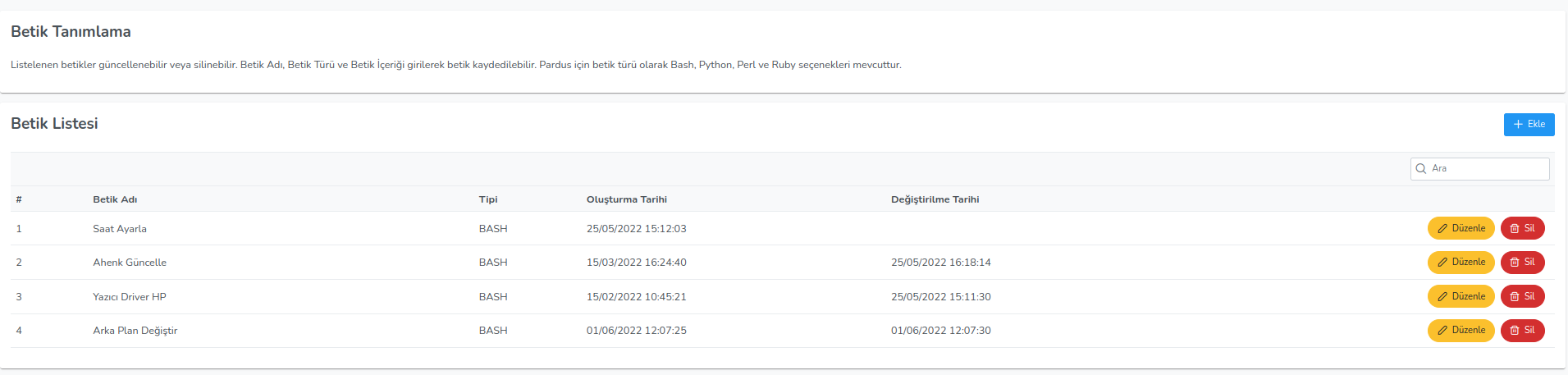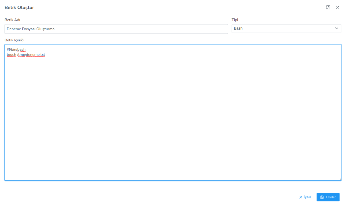 Script plugin is a task plugin that enables specially written script files to be run on Ahenk machines. The script name is entered. Then the type of script is selected from one of Python, Bash, Perl and Ruby. One of the created scripts is selected and the task is run by specifying the script parameters(if any).