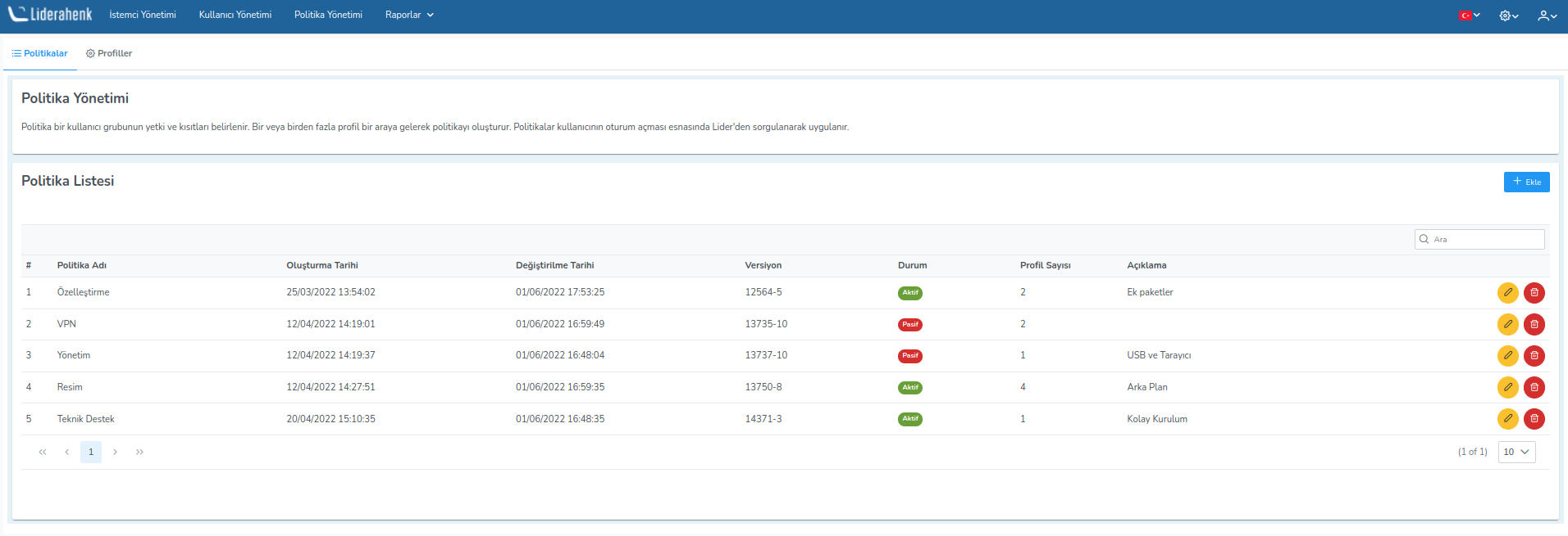 Politika bir kullanıcı grubunun yetki ve kısıtları belirlenir. Bir veya birden fazla profil bir araya gelerek politikayı oluşturur. Politikalar kullanıcının oturum açması esnasında Lider'den sorgulanarak uygulanır.