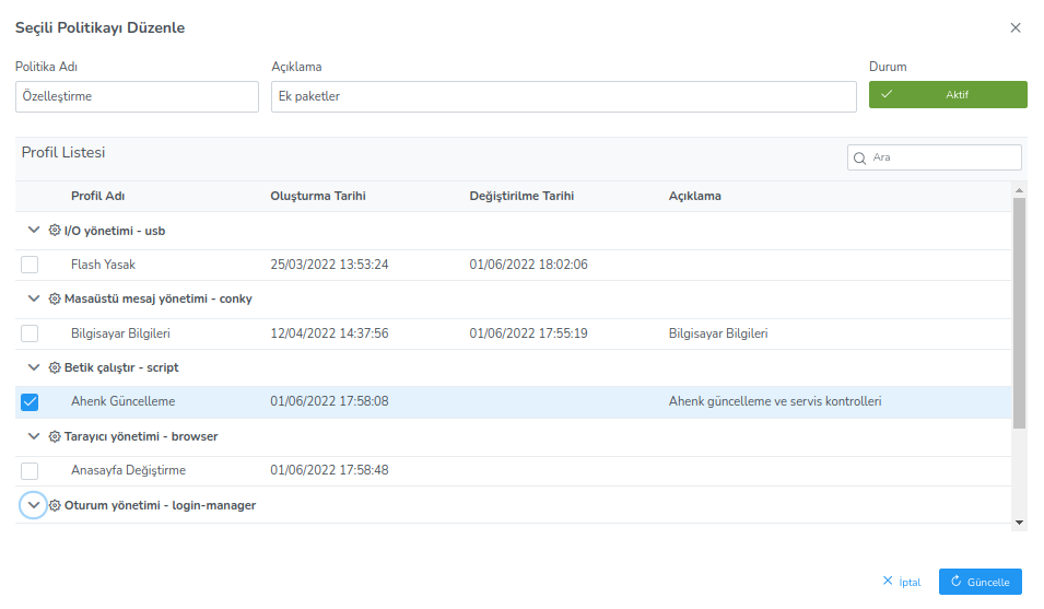 Oluşturulan politikalar düzenlenebilir, ismi değiştirebilir veya aktif/pasif durumları gözlemlenip değiştirilebilir.