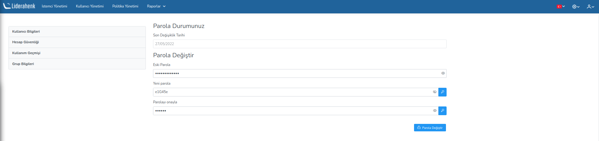 Hesap Güvenliği Hesap Güvenliği Liderahenk uygulamasına girişi yapan kullanıcının parola durumunu gözlemleyebildiği sayfadır. Kullanıcı kendi parolasını değiştirebilir.