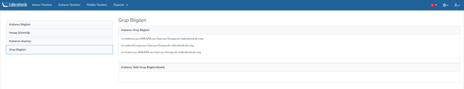 Grup Bilgileri Grup Bilgileri Liderahenk uygulamasına girişi yapan kullanıcının LDAP üzerinden dahil olduğu Kullanıcı Grup Bilgileri ve Kullanıcı Yetki Grup Bilgileri(Sudo)'nin görüntülediği sayfadır.