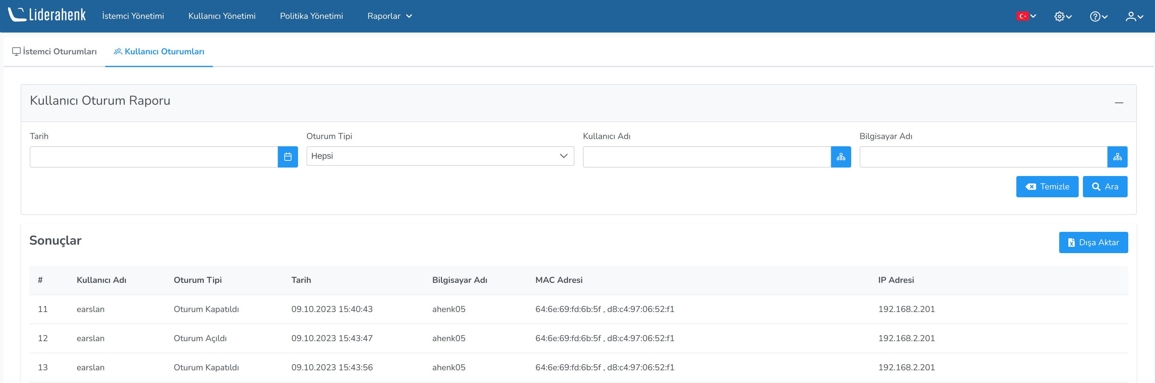Kullanıcı Oturumları Kullanıcı Oturumları Kullanıcı Oturumları sayfasında istemcilerin üzerinde oturum açan kullanıcıların gösterildiği ve istemci, kullanıcı adı ve tarihe göre filtrelenebilen sayfadır.