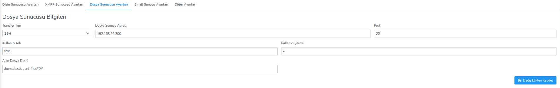 Dosya sunucu bilgilerinin tutulduğu alandır.Bu alan transfer tipi, dosya sunucu adresi, port, kullanıcı adı ve kullanıcı şifresi değiştirilebilir.